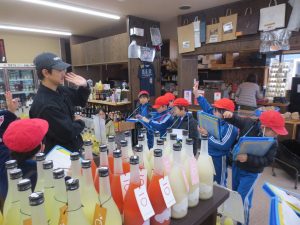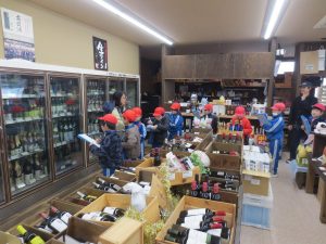 ひしやさんに、行ってきました。たくさん並んでいる商品の種類をメモし、仕事の内容について質問しました。仕事は、お客様が商品を選ぶお手伝い、お酒の配達などです。「仕事をしていてうれしいときは」という質問には、「一緒に働いてくれている仲間とお客さんに喜んでもらったとき」というお答えが返ってきました。