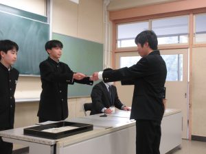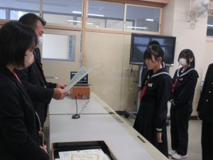 本日は冬休み前の最終日だったため、冬休み前全校集会を実施しました。集会は感染症対策のため、オンラインで実施しました。集会に先立ち代表生徒は対面での表彰を行い、様々な分野で生徒が賞状を受け取りました。あいさつ標語の表彰については生徒会が行い、堂々とした姿が見られました。