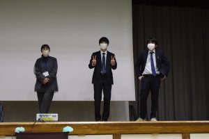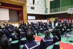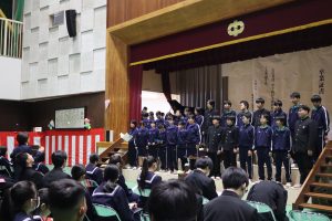 また、10月から12月にかけて参加したボランティア活動の報告会も実施しました。代表生徒がスライド資料を使ってこれまで自分たちが頑張ってきたことを全校生徒に報告しました。