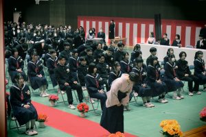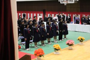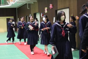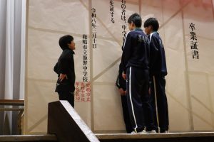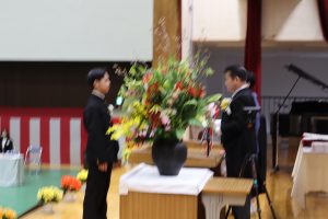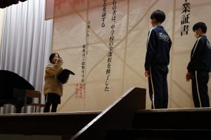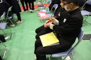 本日は冬休み前の最終日だったため、冬休み前全校集会を実施しました。集会は感染症対策のため、オンラインで実施しました。集会に先立ち代表生徒は対面での表彰を行い、様々な分野で生徒が賞状を受け取りました。あいさつ標語の表彰については生徒会が行い、堂々とした姿が見られました。 また5時間目には、大掃除を行いました。古くからある教材等の運搬を進んで行ったり、教室や廊下をピカピカに磨いたり、一生懸命に活動する生徒がたくさんいて、すばらかったです。