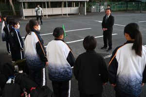 【駅伝部】県大会にむけて出発本日、水戸信用金庫スタジアムにて開催される。茨城県総合体育大会 駅伝競走大会に出場するために、6時にバスが出発しました。校長先生を始め、先生方が早朝にも関わらず見送りにきてくださいました。ありがとうございます。