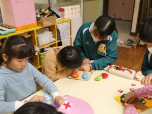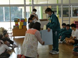 本日も3年生の先週とは別のクラスが、幼稚園実習に行きました。 和気あいあいと楽しそうに触れ合う様子が見られました。