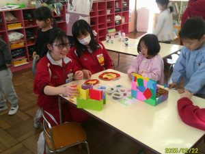 本日も3年生の先週とは別のクラスが、幼稚園実習に行きました。 和気あいあいと楽しそうに触れ合う様子が見られました。