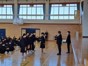離任される先生方,大変お世話になりました。ありがとうございました! 本日、修了式が1・2学年そろって体育館で執り行われました。 各学年代表生徒から1年の振り返りと来年度の抱負の発表がありました。