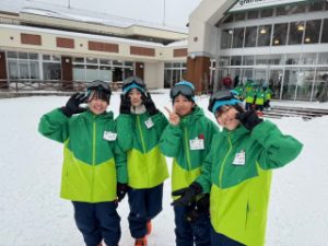 雪が降る中、1年自然体験学習の2日目がスタートしました。今日は、いよいよどのグループもリフトに乗って、昨日の練習の成果を試します。