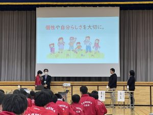 1学年では、キャリア形成講演会が行われました。 ゲストティーチャーの話を聞き、将来「働く」ことについて考えるきっかけとなりました。