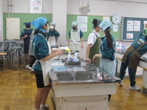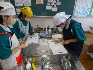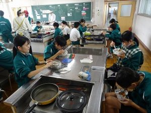 1学年家庭科で各クラス順番に調理実習が行われています。今日は1Eでした。「鮭のちゃんちゃん焼き」を作っています。班ごとに協力して調理しています。試食をさせてもらったら、とても上手に調理されていました。