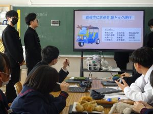 本日、鹿島中学校だより「秀群」(ほむら)第8号を配信しました。 ホームページ上部の「学校だより」から見ることができますので、ご覧ください。また学校配信メール「tetoru」でも本日配信しました。 ※ 秀群(ほむら)の意味、知っていますか? → 秀群(ほむら)とは「すぐれた生徒の集まり」を意味しています!! 本日、1年生が総合的な学習の時間において学級発表会がを行いました。 「鹿嶋市をより魅力的な場所にするためにはどうしたら良いのか?」について考え、課題と解決策についてクラスメートと協力してスライド作成等を行いました。自分たちの住む故郷の魅力を伝えようと意欲的に発表に取り組んでいました。