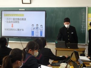 本日の5,6時間目に2学年の総合的な学習で行っている、適塩弁当プロジェクトの最終発表会がありました。 茨城県健康推進課やカスミ、アントラーズ、鹿嶋市教育委員会の方々に協力をいただいて進めているこの企画。総まとめとして、事業者の方をお招きして、1年間自分たちが考えた適塩弁当の最終プレゼンテーションを行いました。 終始、緊張した様子でしたが、事業者の方からお褒めの言葉を頂き、生徒も達成感の味わえるとてもよい機会になりました。 プレゼンテーション終了後、事業者の方は適塩弁当の発売に向け、入念な打ち合わせを行っていました。