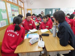 本日、2学年において鹿嶋市留学生英語交流授業が行われました。最初は、緊張している様子がありましたが、慣れてくると質問も飛び交い、積極的に交流する様子がありました。