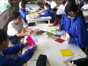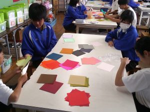 本日美術科の授業で「いろがみ」を使った色の学習をしました。 色の特徴を造形用語を使って説明することが目標です。 グループで100色あるいろがみをグループ分けしたり、色の特徴を探ったりと、色三昧の活動となりました。