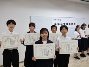 本校では毎年、国語の授業の一環として全学年で「少年の主張」に取り組んでいます。生徒たちは、社会への意見や未来への思いを作文にまとめ、表現する力を養ってきました。 このたび、鹿嶋市青少年育成市民会議により優秀作品が選ばれ、先日表彰式が行われました。受賞した生徒は、堂々とした態度で賞を受け取り、思いを伝える喜びを実感していました。 なお、受賞代表作品は、FMかしまで11月25日までの毎週火曜日、「ひるどき76.7」内の12:40頃に放送されています。お時間のある方は、ぜひお聴きください。