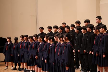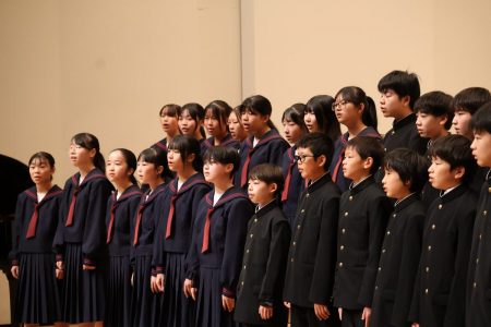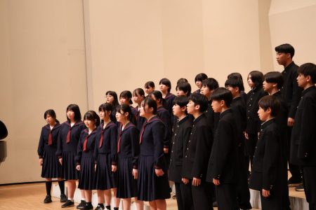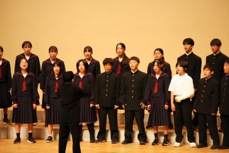【二年生】これまでの経験をもとに、より高い表現力に挑戦。ハーモニーを意識した歌声や、指揮者・伴奏者との息の合った演奏に、成長した姿が感じられました。学年としてのまとまりと協調の力が一層深まりました。