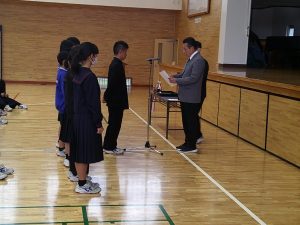 1学年は、学年朝会で後期学級委員の役員任命と鹿華祭(文化祭)の表彰が行われました。