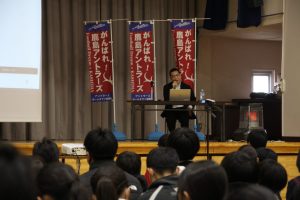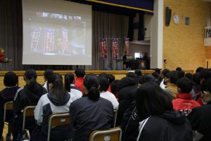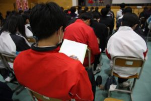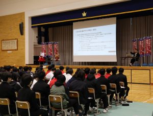 講話では、小泉氏の中学校時代から現在に至るまでの歩みや、その時々に抱いていた人生観について詳しくお話しいただきました。トップランナーとして活躍される方の実体験に基づいた言葉に、生徒たちは真剣な表情で耳を傾けていました。