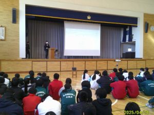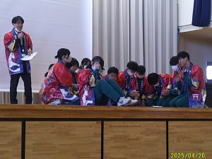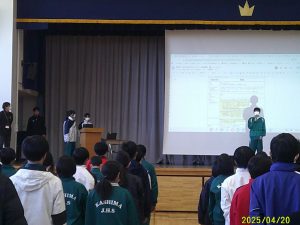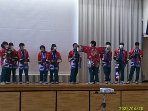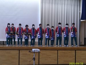 2学年総合の時間に、今週7日(土)「郷土検定県大会」の出場メンバー壮行会が行われました。県大会に向けて練習に励むメンバーが、デモンストレーションで早押しを披露してくれました。問題を読み終える前に予想で答える場面には「お~!」と感心する声があがりました。併せて、その時に着用するオリジナル法被も披露されました。