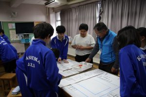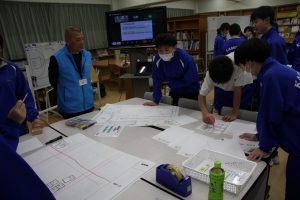 生徒たちは、次々と届く避難者の事情(高齢者や幼児、病気、ペット同伴など)に戸惑いながらも、委員の皆様のアドバイスを受け、熱心に避難者の配置について議論していました。