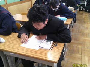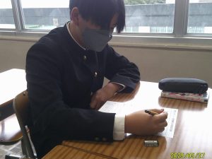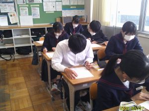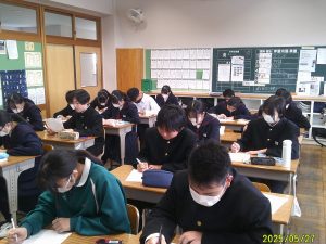 本日は、2学年ではYOMUワークシートを行いました。YOMUワークシートは、国語力向上のために毎週木曜日の朝の時間に5分~10分程度で実施しています。どの生徒も一生懸命問題に取り組んでいる様子があります。