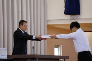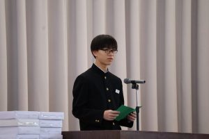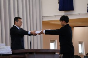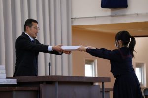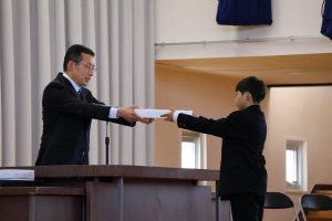 本日、令和7年度修了式を挙行し、1・2年生が凛とした表情で集い、今年度最後の節目に臨みました。代表生徒による作文発表では、この一年間の歩みを真摯に振り返り、次年度に向けた力強い決意が語られました。また、各クラスの代表生徒に修了証が手渡されました。クラス全員の努力と成長が詰まったその証を受け取る代表生徒の姿からは、この一年間で築き上げた自信と責任感が伝わってきました。