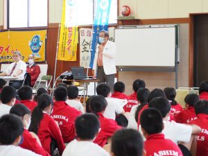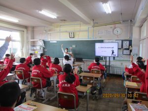 本日のスマイルタイムは生徒会レク「誰が歌っているのでしょう!」 代表の先生が歌い,誰の歌声かを当てるクイズでした。新しい電子黒板でzoomを利用し,解答はカメラに写して示しました。意外と高い正答率。先生の声,わかるんですね。