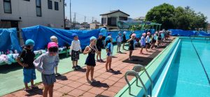 ペットボトルやケチャップの容器に水を入れて水遊びをしました。 水を飛ばしたり、水を掛け合いっこしたりして、楽しく活動しました。