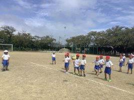 晴天の中、ドッジボールをしました。 ルールを守り、元気いっぱい活動することができました。
