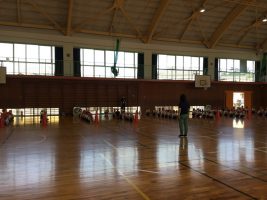 体育館にて、国語や音楽で学習したことを元気いっぱい に発表しました。