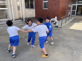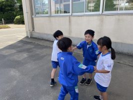 体育の学習で、なわとびの練習をしました。縄をむすぶ、ほどく、持ち方の基本的なところを確認しました。昼休みには、自分でむすんでほどこうと頑張る1年生がたくさん見られました。
