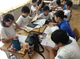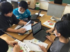 夏休み中にゴミ拾いや節電など環境活動に取り組んだ結果やわかったことをスライドにまとめて発表しています。 この反省をもとに、さらに調べ学習をして発表会に向けて準備していきます。