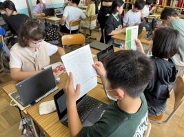 本やポスターが部屋のどこにあるかをonやinなど前置詞を使って説明しています。 正しく説明できるように何度も友達と一緒に練習しています。 道案内をするために表現方法も学んでいます。