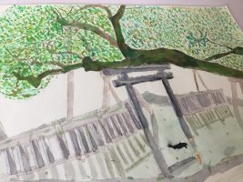 写生会で描いてきた絵に色を塗っています。 鹿島神宮の歴史を表現しようと、色を作り、重ねて、根気強く塗り続けています。 どんな作品に仕上がるか、楽しみですね!