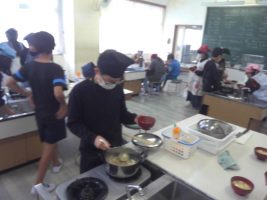 きれいな紙コップ花火ができあがりました。 お味噌汁の調理実習を行いました。煮干しから出汁を取ったり、具材を適切な切り方で切ったりして 作りました。とても美味しくできました。「ネギは煮ずに添えたほうが美味しい」という児童も多く、 最適な調理方法を探しました。
