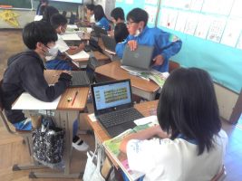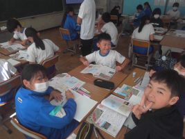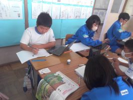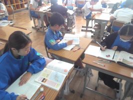 英語のでは、ALTといっしょに、楽しく学習しています。 ジェスチャーを交えて、大盛り上がりです。 また、今週からは、実習生も一緒に学習に取り組んでいます。