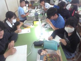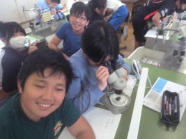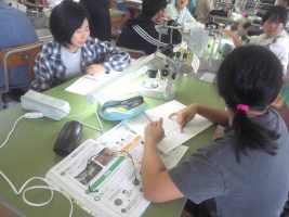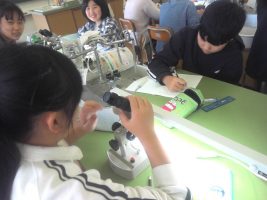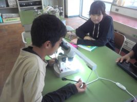 みんなでポスターをつくって、大きな声であいさつすることができました。 理科の地層の学習で、土に含まれる物質を顕微鏡を使って観察しています。 土の中にも色々な鉱物が含まれていて、驚きました。