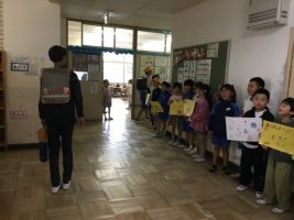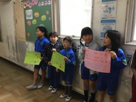 10月のあいさつ運動のたんとうは、2年生でした。 今日は、風が強かったのでしょうこうぐちの中であいさつ運動をしました。
