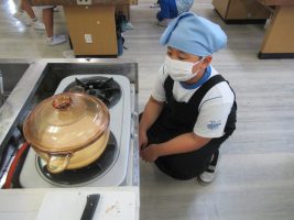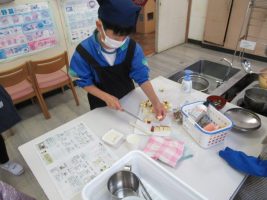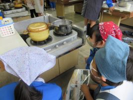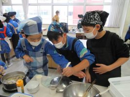 家庭科の学習で、ご飯とお味噌汁を作りました。恐る恐るご飯を炊いている様子でしたが、どの班もおいしく炊くことができました。味噌汁は煮干しで出汁をとって香りよく、さつまいもで秋を感じることができました。