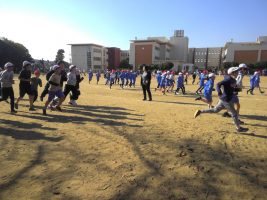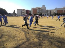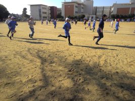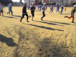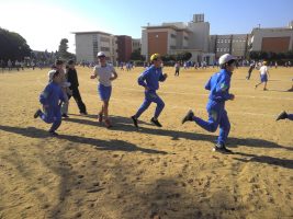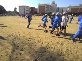 業間休みに持久走の練習をしています。昨年の持久走のタイムを更新できるように、自分のペースで走っていきます。