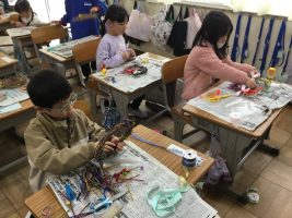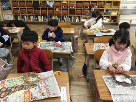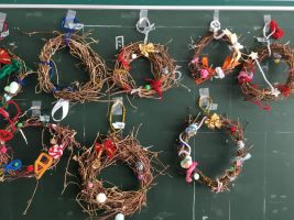 生活科の学習で大切に育てたアサガオのつるを利用して アサガオのリースを作りました。 子ども達は、準備したモールやリボンなどをつけて すてきなリースを作りました。