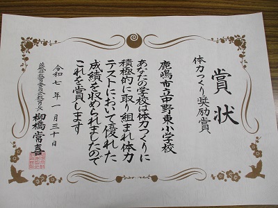 「体力つくり奨励賞」は、体力・運動能力調査において、昨年度の結果と比較して顕著な向上が図られた学校に対して与えられる賞です。体育の授業や業間、昼休みの外遊びを工夫して、子ども達が一生懸命体力つくりに励んだ結果だと思います。これからも、体力向上のため子ども達が楽しく運動できる工夫をしていきたいと思います。