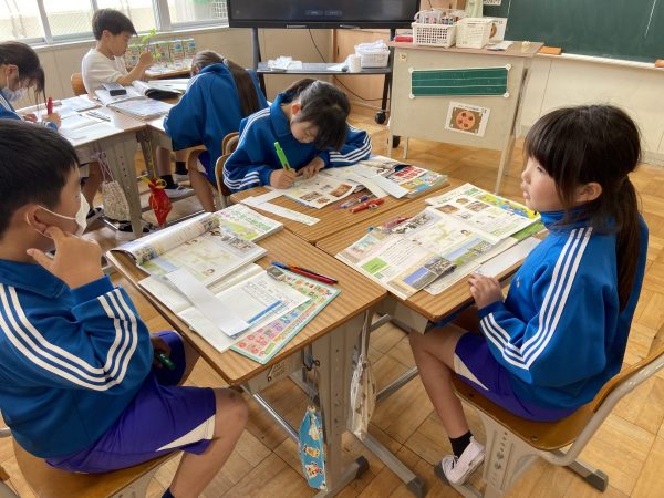 5年1組は、社会科の学習で資料を読み取り、気が付いたことを共有しました。5年2組は、算数科の学習で小数のかけ算の筆算のしかたを学習しました。