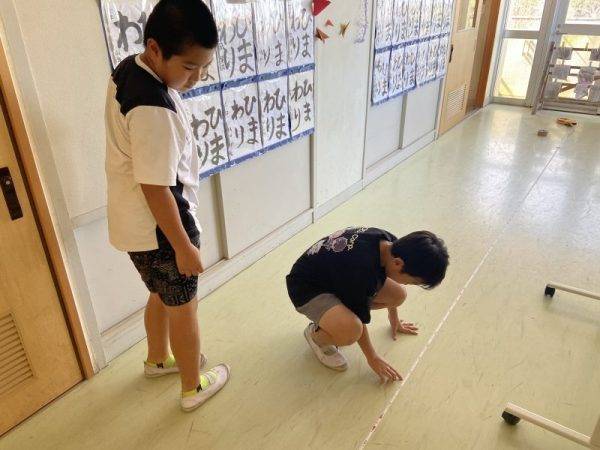 2組は、算数科「平均」の学習で、自分の歩幅を求めました。歩幅を使って、気になる長さを測れるようになるといいですね。