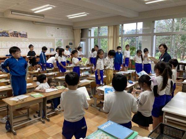 さあ!後期スタートです(^^)/10月14日(火)3連休が終わり、後期スタートです。低中高学年ごとにブロック集会を開き、心構えや目標について話し合いました。4時間目に1年生が国語「くじらぐも」の学習で楽しそうに活動していました。予定されていた「たてわり班愛校作業」は、直前に小雨が降ってきたため来週に延期となりましたので、くじらぐもと給食と昼休みをまとめて掲載します。週末はいよいよ6年生の修学旅行ですね!(^^)!