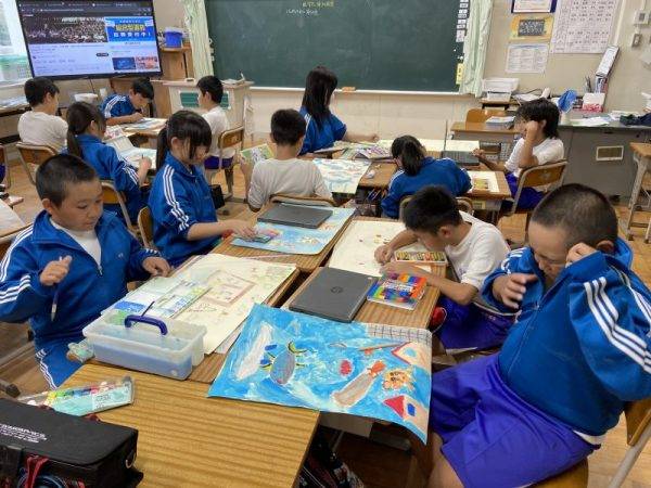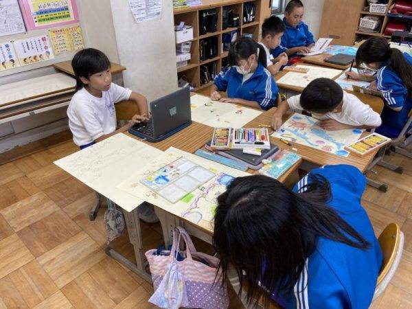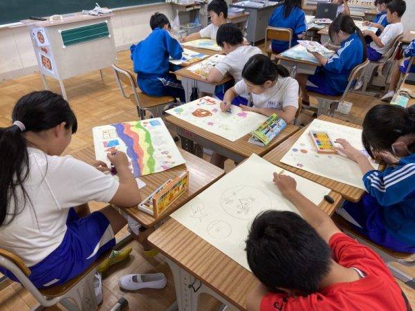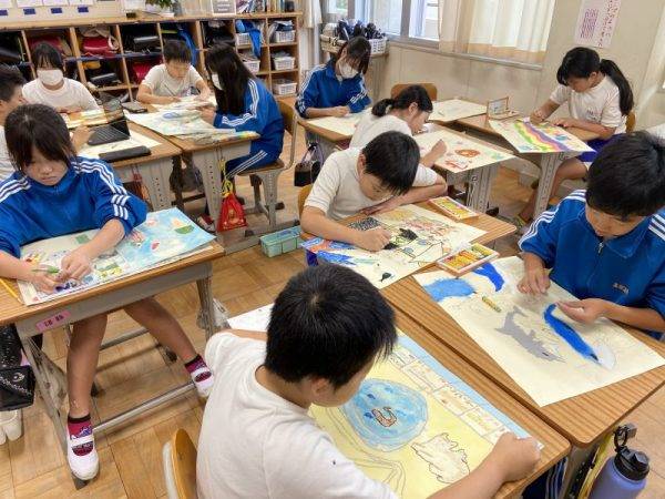 「こんな町があったらいいな」をクレヨン、クーピー、絵の具などを使って、海の中の町やおかしの町など、たくさんの町を考えて表現しました。みんなが考えた町が実際にあるといいですね。