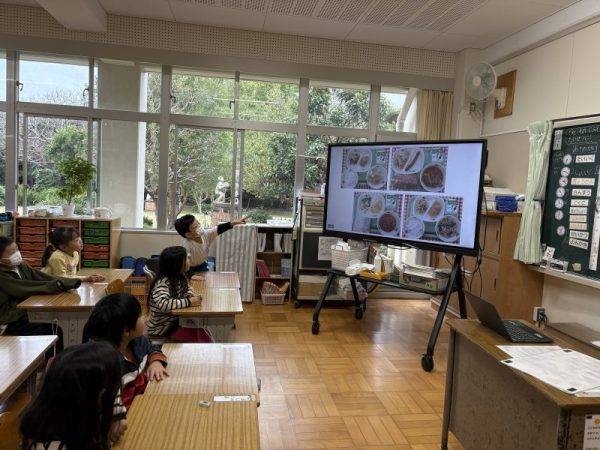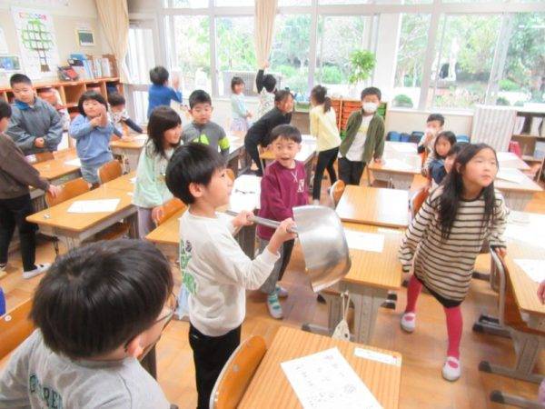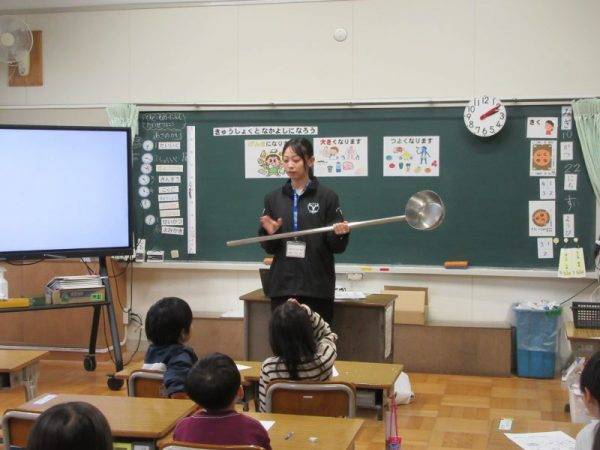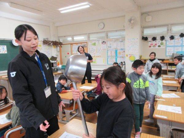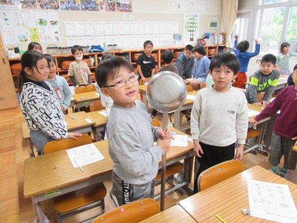 10月23日(木) 昨日のことですが、栄養教諭による食育訪問指導が1年生で行われました。見たことがない大きさのおたま?(ひしゃく)を実際にさわってみて、目をキラキラさせながら「おおきい~」とか「見た目よりかるい!」などなど…様々な感想が出ていました。