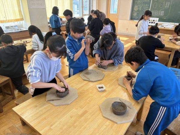1月22日(木)今日は、笠間市の大津晃窯から先生をお招きして、4年生が笠間焼体験学習!!   はじめに作り方を教えていただいて、お皿、コップ、おきもの…思い思いの作品作りに目をキラキラさせて取り組んでいました(^^)/ 先生が持ってきてくださった道具は、ボランティア精神旺盛なみなさんが手伝ってくれました。みなさんありがとうございました‼