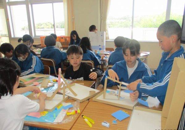 5年生の図画工作の授業の様子です。ビー玉の転がり方を確かめながら、コースの作り方を工夫し、友達と協力して楽しそうに学習を進めていました。