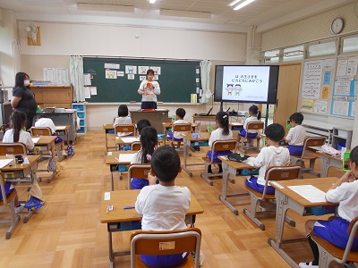 4校時、1年生の教室では保健室の先生と担任の先生で一緒に、学級活動の授業が行われています。