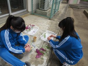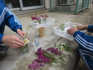 校庭に咲いている春の花々を摘んで、生けてくれているのは6年生。