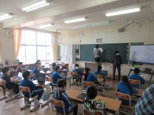 ↑【避難経路を確認する4・5年生】 ↑【事前指導で動画教材を視聴している3年生】