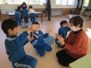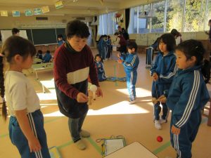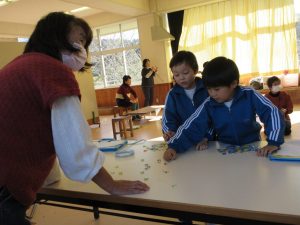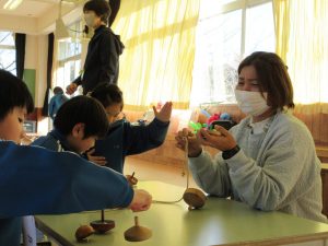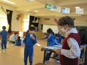 地域の方々を講師にお招きし、1・2年生が昔の遊び体験をしました。講師の皆さんに教えてもらいながら、楽しい時間を過ごしました。おはじきやヨーヨー、けん玉にあやとり。こまにだるま落とし。かるたもプレゼントしてもらいました。たくさんの「できた」「じょうずになった」が聞こえる笑顔いっぱいの1時間でした。